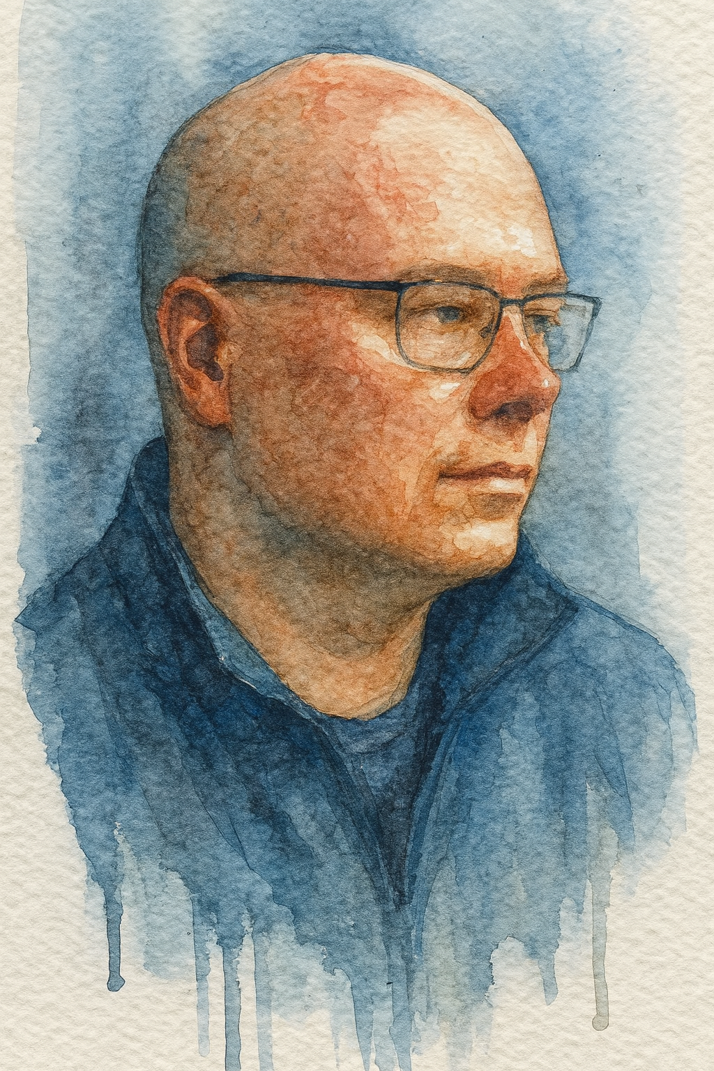 Create a vertical 9:16 watercolor portrait using my provided photo as the subject: shoulders-up, subtle three-quarter view facing right with a calm, introspective expression. Use a restrained palette of indigo, Prussian blue, and Payne’s gray for background and clothing, with warm peach/beige/umber glazes for skin. Emulate hand-painted watercolor techniques—translucent layered washes, soft wet-on-wet gradients, backruns/blooms, delicate dry-brush and fine linework for hair and lashes, crisp accents at the eyes, nose, and lips, and lost-and-found edges along the jaw and neck. Light softly from the left to create cool, desaturated shadows; place the lead eye near the upper-right third. Keep the background minimal: airy blue-gray washes with splatter and a few downward drips that melt into a loosely indicated denim collar, all on subtly textured hot-press paper. Maintain a cool, contemplative mood with a matte finish—no photographic or lens effects—prioritizing illustrative, painterly qualities and the original artwork’s atmosphere.