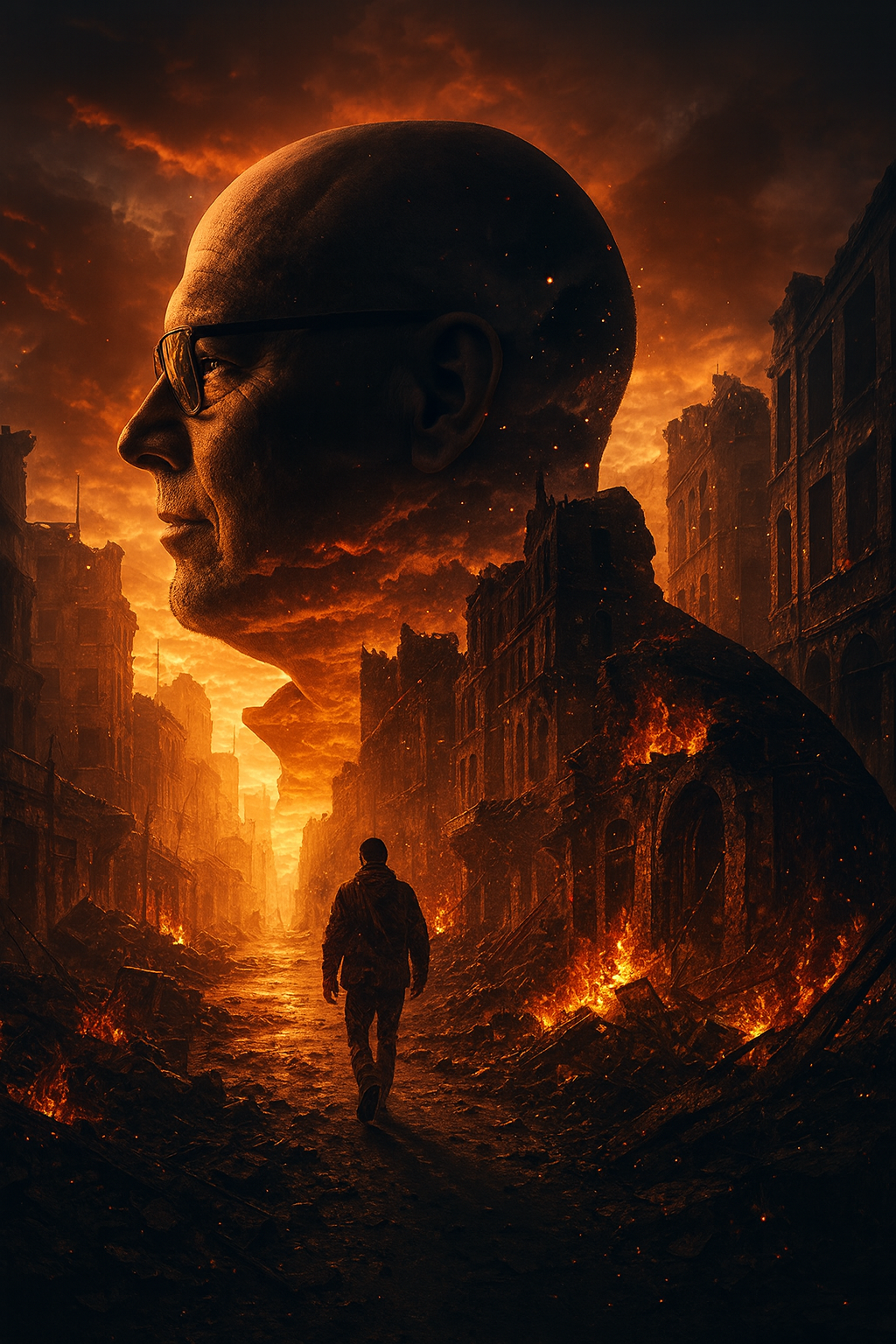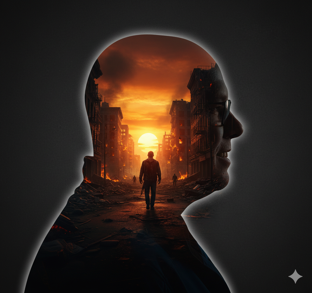 cinematic double exposure of me in profile post apocalyptic cityscape inside his silhouette.the inner scene shows the man walking through a destroyed, burning urban street.buildings in ruins glowing embers and fire, with a dramatic sunset in the background. Moody lighting, warm tones emotional and introspection mood, high detail, 8k resolution.Ratio 3:4